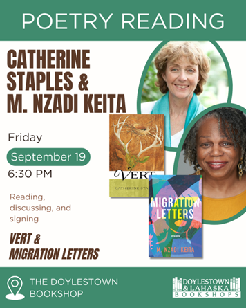 Doylestown, PA. Nzadi Keita and Catherine Staples reading from their new books on Friday, September 19, 2025 at 6:30 pm at The Doylestown Bookshop. 16 S Main St, Doylestown, PA 18901.